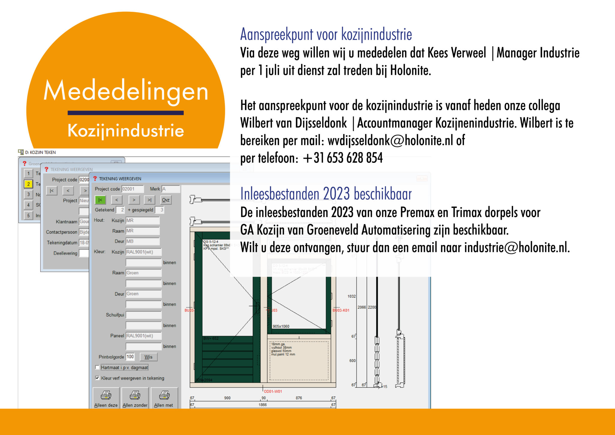 Gepubliceerd op: 29 november 2022Graag willen wij u mededelen dat Wilbert van Dijsseldonk per 1 december (weer) indienst treedt bij Holonite, dit in zijn voormalige functie als Accountmanager Kozijnindustrie.