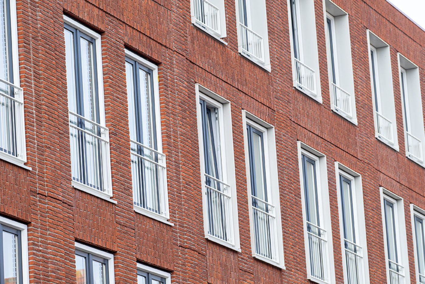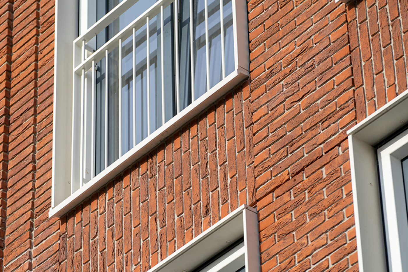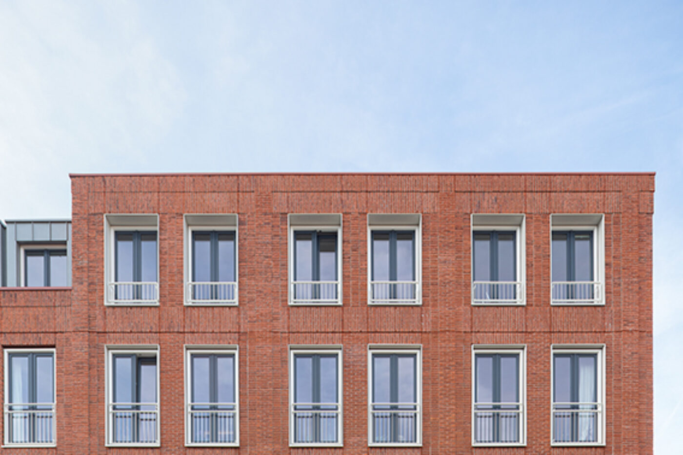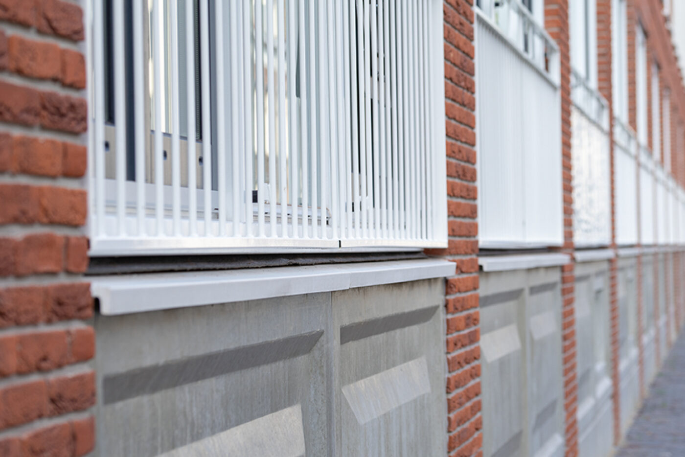 In het gehele pand treft u de raamkaders van Holonite. Dergelijke kaders zijn opgebouwd uit lateien, dagkanten en raamdorpels. Een maatwerkproject waarbij de wensen vanuit de opdrachtgever centraal stonden voor het ontwerp. In dit project heeft men gekozen voor subtiele raamkaders, uitgevoerd in de basiskleur wit. De combinatie van de vlakken, de terugliggende raampartijen en de Holonite raamkaders geven het gebouw een rustige en statige uitstraling. Zoals A3 Architecten het zo mooi omschrijft: “De grensregeling boven de plint vertoond een rustige ritmiek met haar verdeling van ramen en vlakken.”